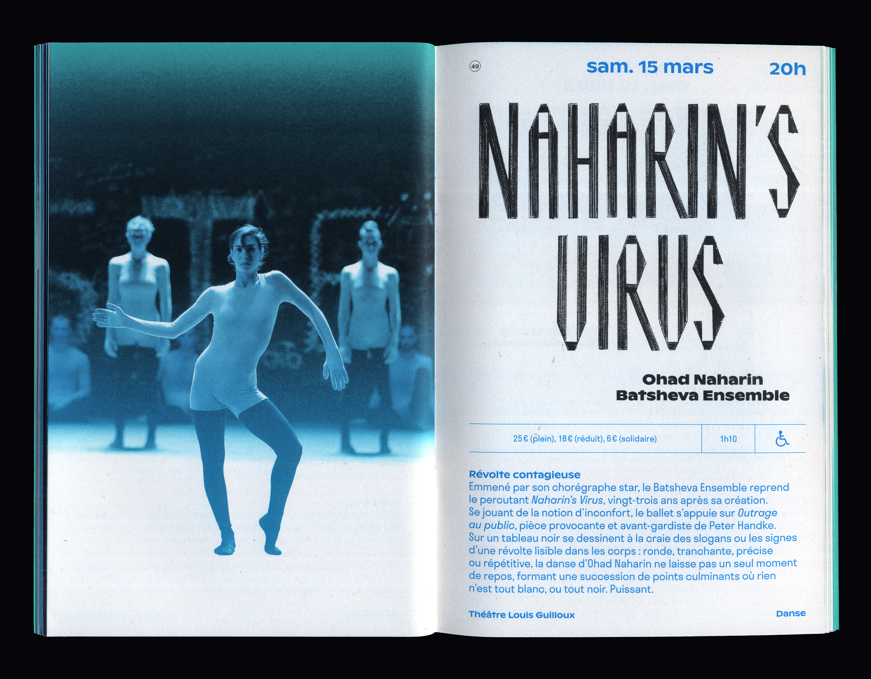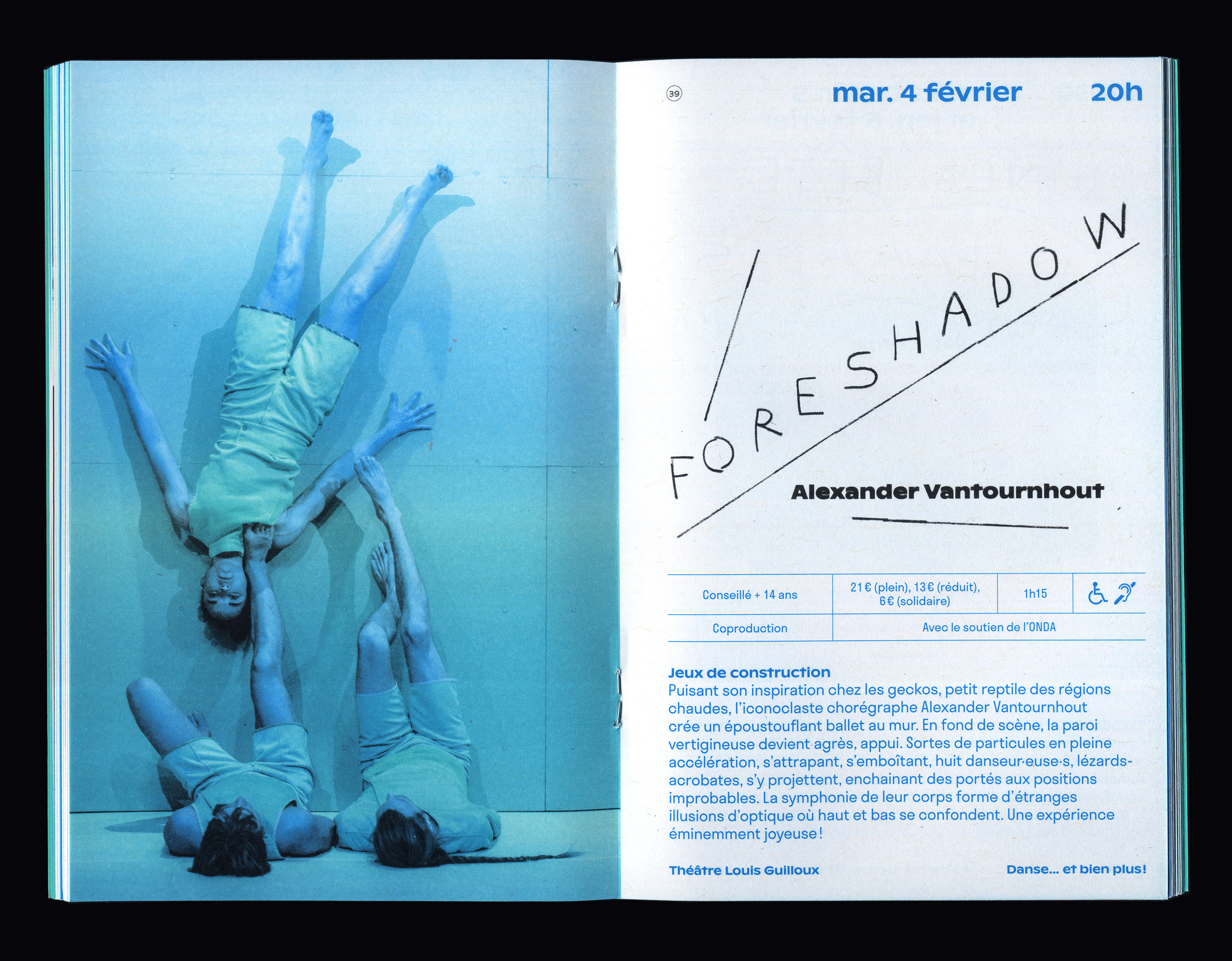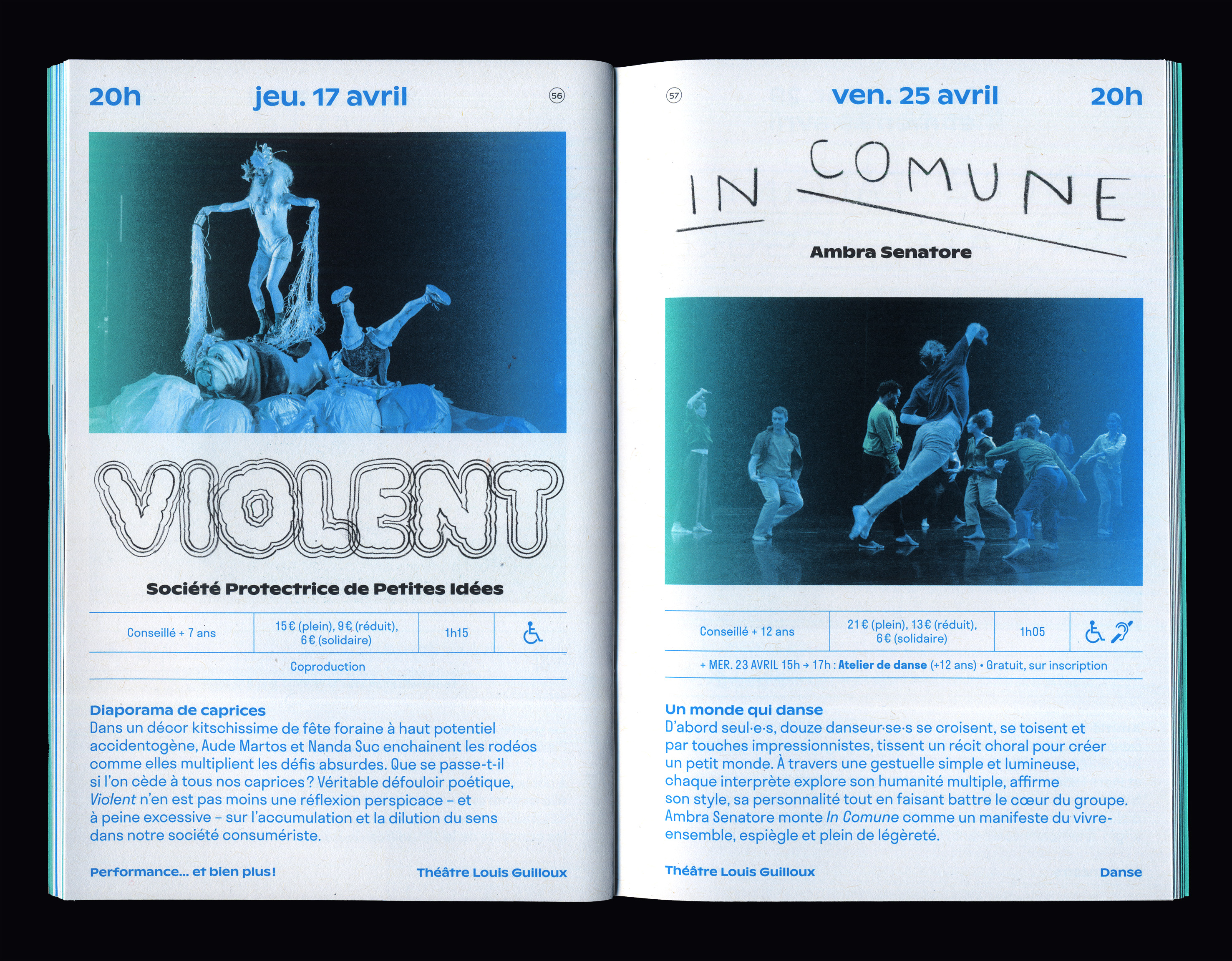 L'identité visuelle est déclinée sur un programme et un dépliant de saison, des journaux trimestriels, des kakémonos, des bâches extérieures, des cartons d'invitation, un formulaire billetterie, un dépliant et une affiche "En famille", des colonnes Morris, des encarts presse, des affiches trimestrielles.