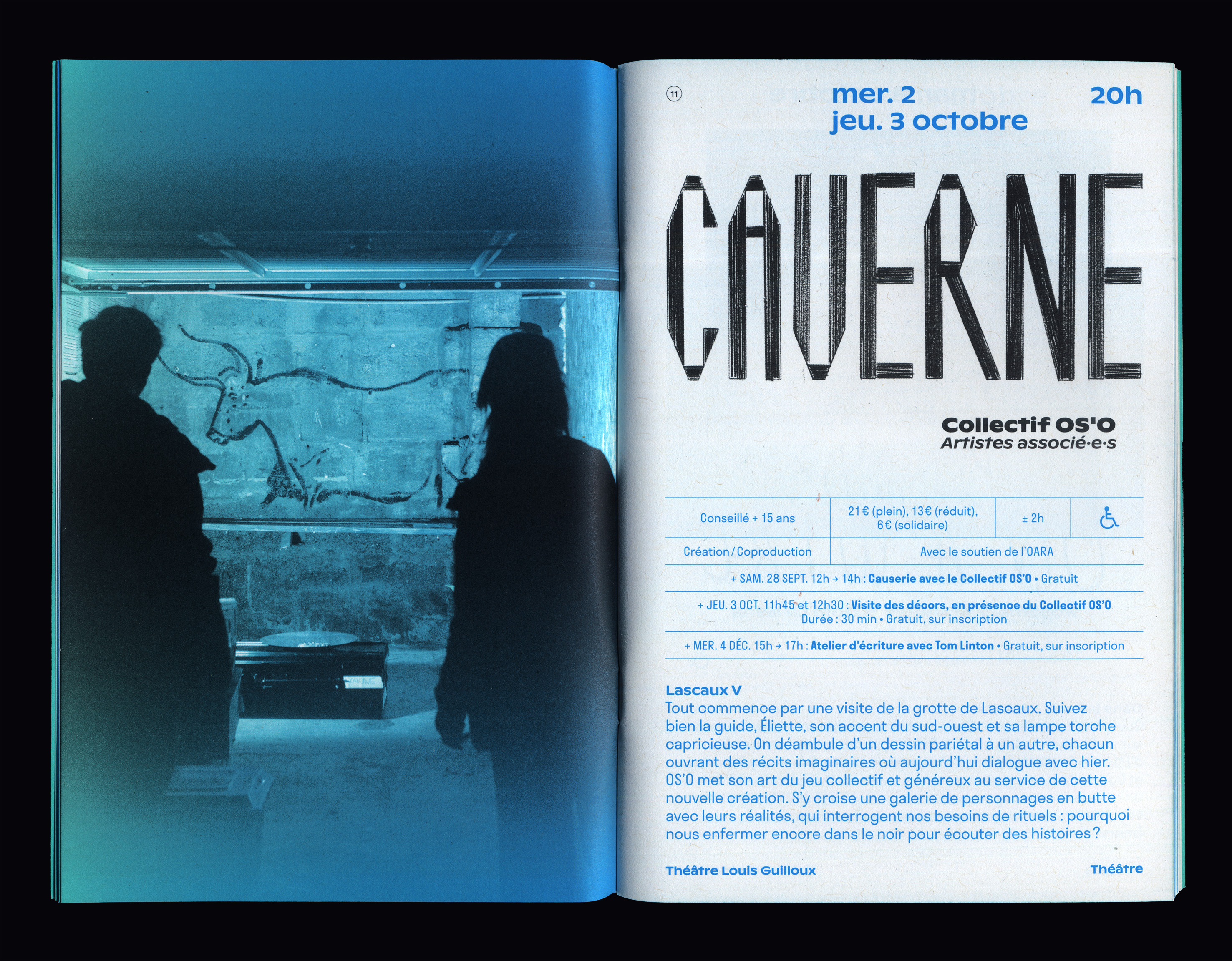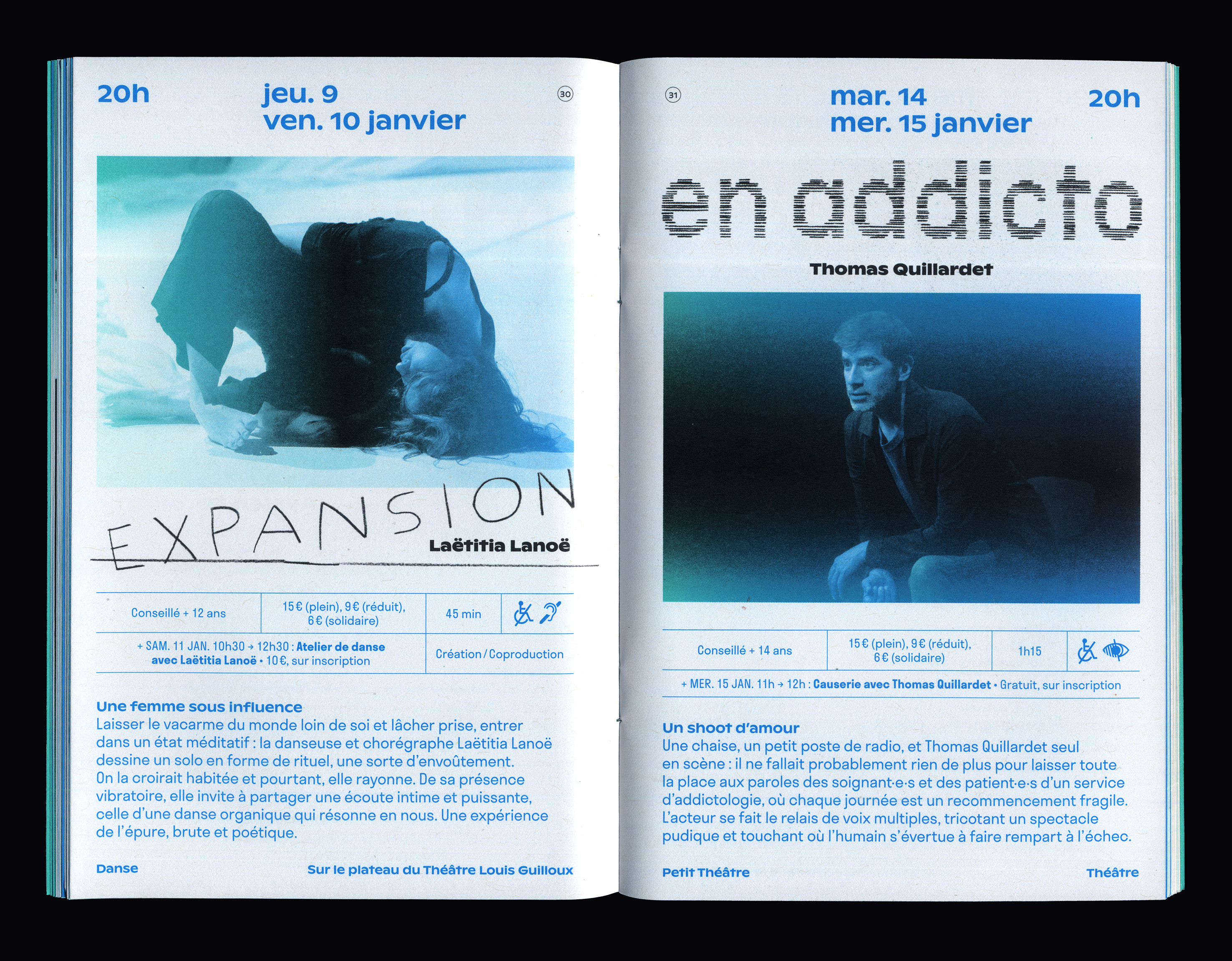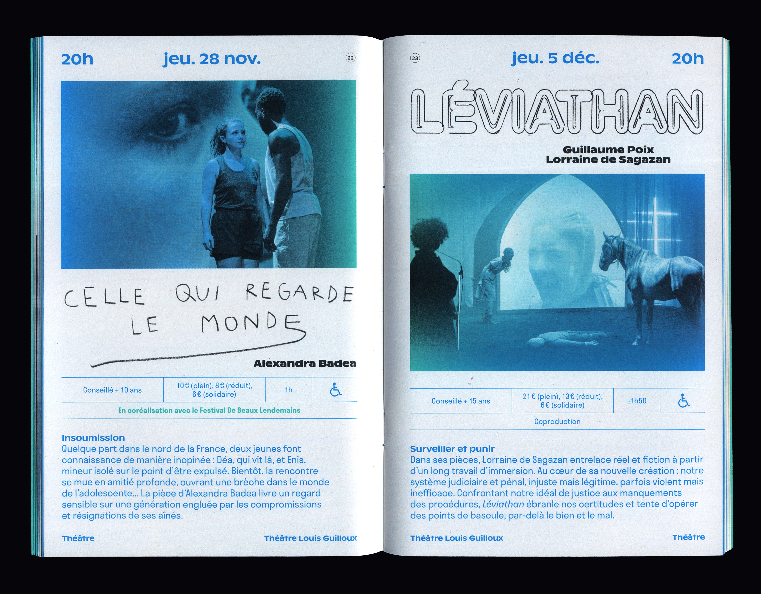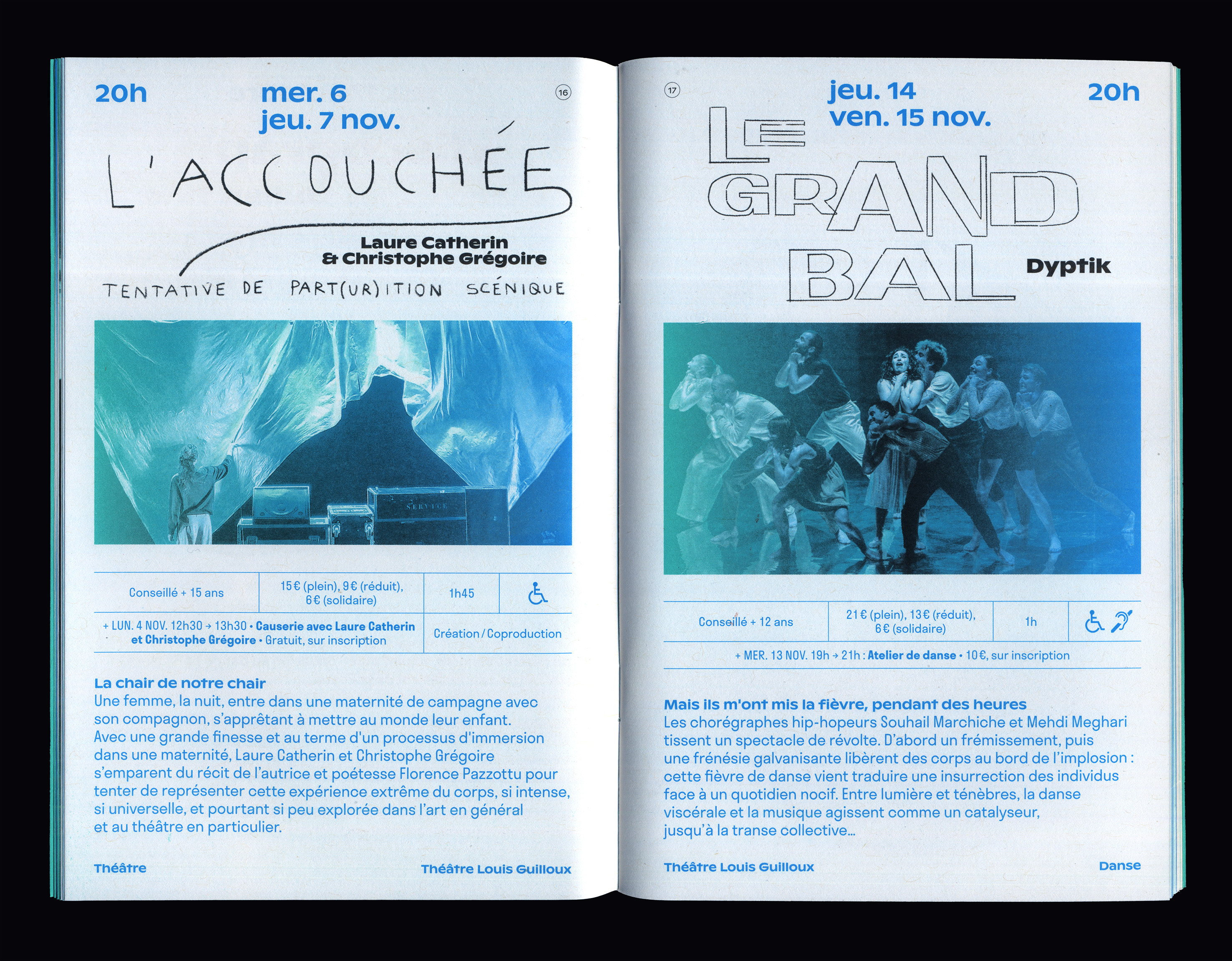 Pour l'identité du théâtre, nous avons créé une boîte à outil dans laquelle nous venons piocher les formes graphiques qui composent les visuels de la saison – dessins, dégradés, lettres manuscrites, typographies. À la manière d’un rébus, la série de dessins livre une première interprétation ludique et énigmatique de la saison et du lieu. Sur les affiches de spectacle, ils laissent place au dessin typographique et à la photographie. Les caractères Ginto, dessiné par ABC Dinamo, et Stratos créé par Production Type s'affichent sur l'ensemble de la saison.