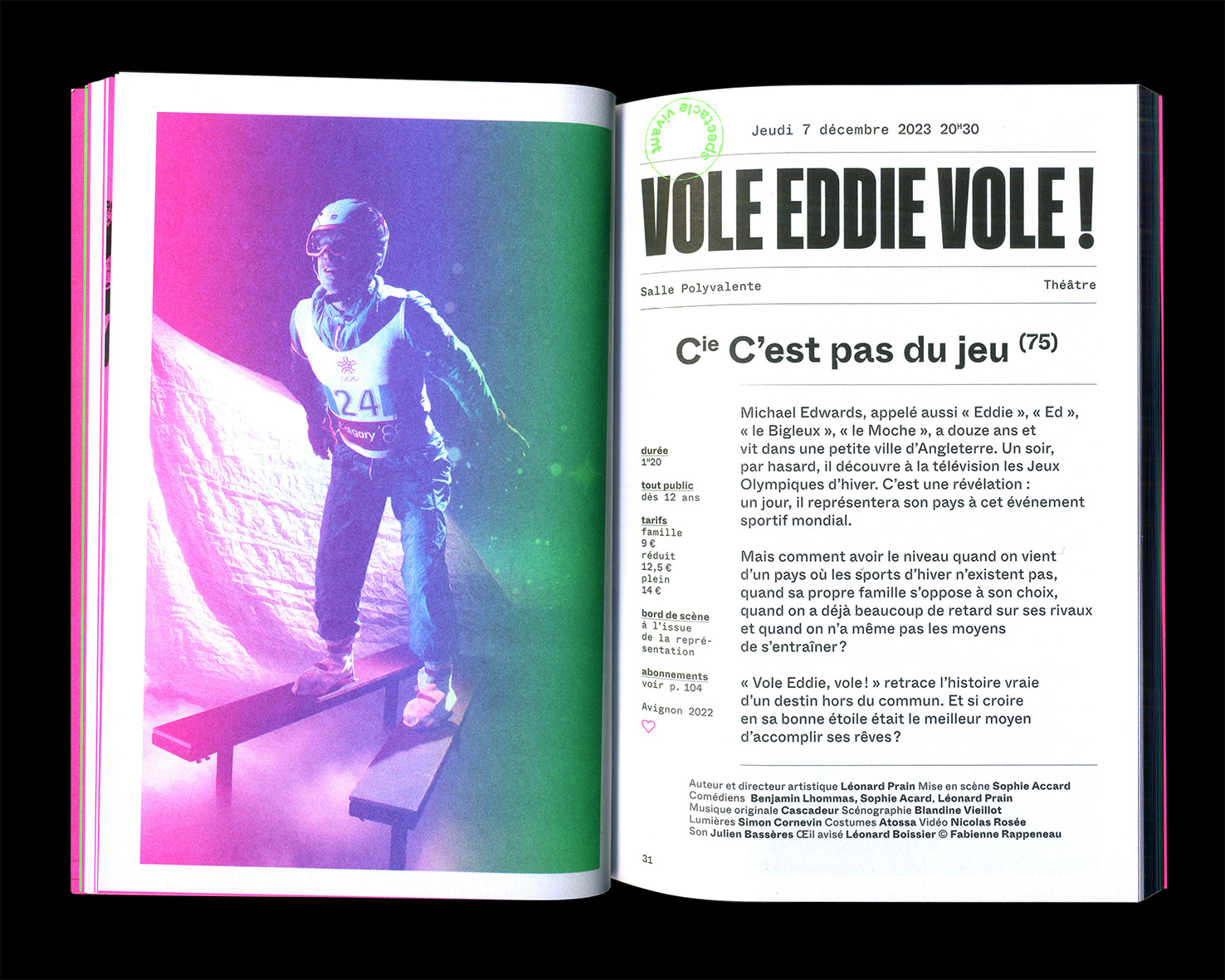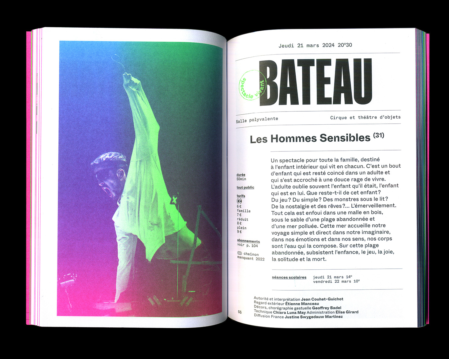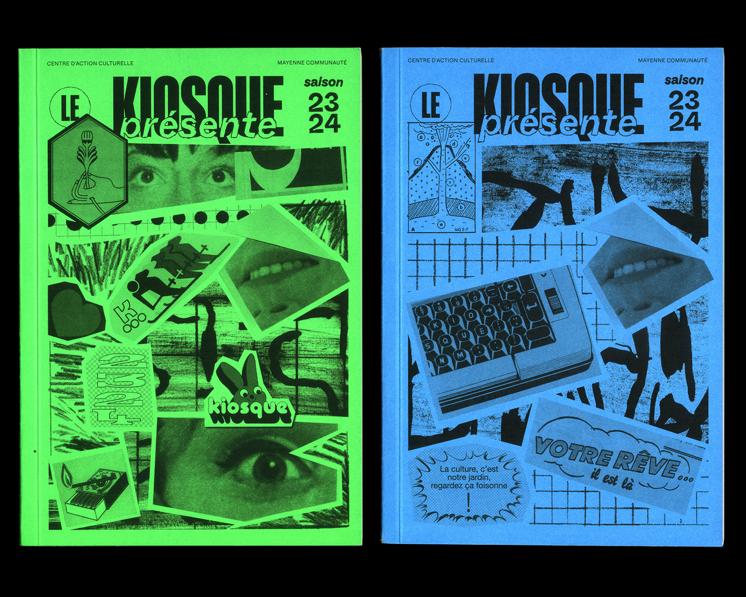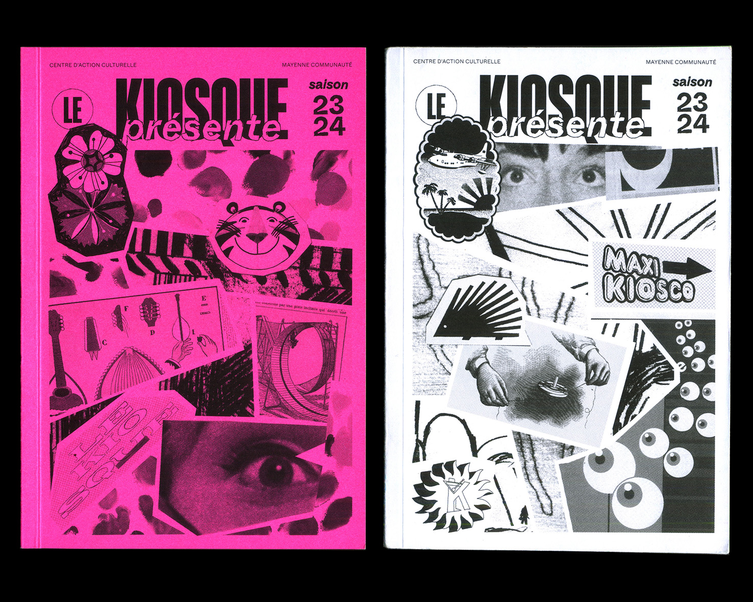 La saison 23/24 se révèle au public par l’affiche de saison présente dans la ville de Mayenne. L’affiche s’inspire des unes de journaux qui se superposent, se dévoilent et s’entassent dans les kiosques. Elle propose un questionnement entre ce qui est visible et ce qui ne l’est pas, entre le réel et le fictif, et fait ainsi écho aux arts visuels et aux arts du spectacle. Le public découvre ensuite les programmes dévoilant les différents visuels, qui composent l’affiche de saison. Par l’association d’images et de références populaires, l’identité graphique propose une aventure plastique, livre une atmosphère et un imaginaire qui raconte le Kiosque et sa saison. Il permet à chacun d’avoir sa propre lecture et met en avant l’humain et la fragilité qui le constitue.
